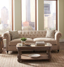 Grace meets comfort with this contemporary style sofa finished in a soft oatmeal color. Lounge around in this fabric upholstered sofa accompanied with a tufted back that adds a decorative touch to this fine piece of furniture. With rolled armrests on each side and metal front legs with casters, this sofa makes for a timeless piece of furniture for your living space. It includes two accent pillows for added comfort.