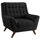 Lend a mid-century modern aesthetic to your living room or den with this Retro Contemporary Sofa Chair - Black. Made with a solid Kiln dried hardwood frame, this chair features tufted chenille upholstery and subtle piping for a tailored appearance, while pocket spring support and padded arms are designed with comfort in mind. Creating a sense of balance, this chair's flared arms echo the angle of its round tapered rubber wood legs. The gorgeous leather upholstery is finished in a black color, allowing you to easily incorporate this fantastic set into any Decor style. Dimensions: 41" x 39.5" x 41"