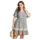 Creative Fresh Color Flower Print Frilled Short-sleeve V Neck Plus Size Dress