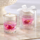 A gentle breeze, waves kissing the shore and the the sweet fragrance of orchids bring an intoxicating ambiance to your destination wedding. What better thank you for your guests than to be able to take home the essence--and the memories--of your wedding? You'll find it all in These fascinating orchid tealight holder. Features and facts: Gorgeous clear-glass tealight holder with faux purple orchid floating in clear gel beneath the tealight/liTealight holder measures approximately 2 3/4" h x 2 1/4" in diameterTea candle includedGift presentation includes clear showcase gift box, white-satin ribbon and bow and coordinated white "For You" tag with purple accentsGift box measures approximately 2 3/4" h x 2 3/8" w x 2 3/8" d