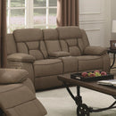 Fabric Upholstered Microfiber Motion Loveseat With Console, Brown