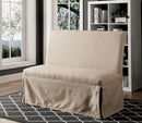 This transitional style love seat bench is designed to blend in beautifully with your home. It has solid wood constructed frame linen like fabric upholstered in beige. It features cushioned seat and back which make this bench a perfect and comfortable sitting arrangement. It also features skirted panels framing all the sides with welting trim. Adorn your bedroom or living room or entry way with this superb bench to awe your visitors.