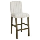 Enhance the appeal of your living space with this wooden constructed barstool. The brown color finished wooden framework provides sturdiness to the barstool. The fabric cushioned seats makes it comfortable. The white and gray color stripe pattern on the seat adds to its appearance. The wooden stretcher on each side provides suitable support to get on or off the stool. The slightly slated back and tapered legs makes it perfect for lounging. This piece would add character to your living room or bar area.