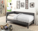 This transitional style twin size day bed is designed to offer you the best comfort and also give your room an elegant touch. It features padded gray linen fabric upholstery with metal and wood frame. It features a corner design and nail head trim. This daybed is perfect comfortable utility for day naps or for lounging with friends for a movie or sleepover.