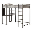 With a casual modern look and functional design, this metal workstation full size bunk bed is a practical addition to your child's bedroom. Featuring a full metal construction, this bunk bed sports a two tone silver and gun metal(black) finish. It includes a built in student desk and shelving, An attached ladder gives ease of accessibility to the top bunk.