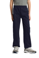8-ounce, 50/50 cotton/poly Covered elastic waistband No draw cord at waist Elastic cuffs Double-needle bottom hem