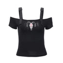 Gothic Style Women Cool Shoulder Short-sleeve Plastic Buckle Strap T-shirts