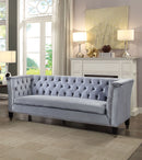 Large, comfortable and full of mid-century style, our Honor sofa is both polished and practical with soft woven upholstery, featuring button tufted detailing and shelter armrest. Strength and beauty are guaranteed with a wood frame and black wooden tapered legs. The nail heads that outlines the front edge of these beautiful pieces add an extra element of elegance.