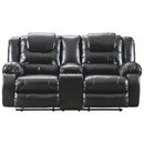 Charm your living room or lounge area with this loveseat, wrapped in black faux leather upholstery. The sumptuous comfort of this reclining loveseat designed to respond to your every move, it features a power adjustable headrest that allows you to recline and still have a great view of the TV while the power lumbar support to get you feeling back on track. This power reclining loveseat?s enticing upholstery is enhanced with tufted back and has a sturdy corner blocked wooden frame with metal reinforced seats and forests. Also, the power touch reclining mechanism and two stainless steel cup holders extend your comfort level while providing a good space to your beverages.