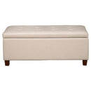 This bench is designed with perfection and brings great style to your place. This sturdily constructed bench is made from durable wood and features a faux leather upholstery in cream color. It comes with a hidden lift top storage under the tufted seat and supported by tapered legs in brown, providing a great contrast. Sophisticated in appeal, this bench provides a comfortable casual seating space in your living room, bedroom, alongside a window and at the enter way. Besides that, the bench is efficient enough in providing you an organized storage to your blankets, bedspreads, pillows, books and other related items.