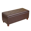 Add color and style to any room with this traditional style bench, designed in rectangular shape. Sturdily construted from wood and plywood with brown faux leather upholstery, this large sized rectangular storage bench offers a timeless look and storage together. Its premium details include subtle button tufting, hinged seat construction, deep storage capacity, and tapered wooden feet with rustic brown finish to complement the design. This tufted bench is ideal to use in any room for storage and seating together.