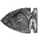 This belt buckle is in the shape of an arrowhead with a large eagles head in the center surrounded by flowers and other design detail. ÊFinely sculpted and intricately designed belt buckle. Our unique designs often become collector's items.Officially licensed Siskiyou Originals product Licensee: Siskiyou Buckle. Fully cast, metal buckle. . .