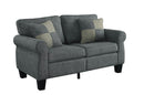 This transitional style love seat comes covered in linen-like fabric finished in a beautiful dark gray color. This love seat is movable, making it extremely convenient to change its placing. Features rolled arms for a charming appearance, this love seat includes overstuffed pillows for a soft and comfortable experience.