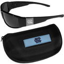 These designer inspired frames have a sleek look in all black with high-polish chrome N. Carolina Tar Heels shields on each arm with an etched logo. The shades are perfect any outdoor activity like; golfing, driving, hiking, fishing or cheering on the team at a tailgating event or an at home game day BBQ with a lens rating of 100% UVA/UVB for maximum UV protection. The high-quality frames are as durable as they are fashionable and with their classic look they are perfect fan accessory that can be worn everyday for every occasion. The shades come with a zippered hard shell case to keep your sunglasses safe.Officially licensed College product Licensee: Siskiyou Buckle. Comes with a hard shell, zippered case with microfiber interior and large team logo on the lid.. Maximum UVA/UVB protection for all outdoor activities from sun bathing by the pool or an the beach to blocking those sun rays on game day. The high-quality frames feature flexible hinges that help prevent breakage and make the sunglasses more comfortable to wear. No die-hard fan's outfit is complete without these N. Carolina Tar Heels wrap shades