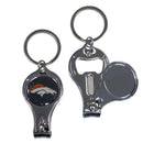 This unique Denver Broncos key chain has 3 great functions! The key chain opens to become a nail clipper, when open you can access the nail file pad and the key chain has a bottle opener. Officially licensed NFL product Licensee: Siskiyou Buckle. Features a nailfile & clippers. Functional bottle opener. High polish chrome finish. Denver Broncos domed emblem
