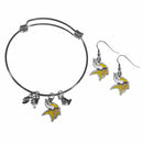 Our trendy Minnesota Vikings charm bangle bracelet is now paired with our most popular dangle earrings for the perfect finish to any fan's outfit. The ajustable wire bracelet with 3 football themed charms and a beautiful team charm that matches the team charm on the earrings. The earrings have hypoallergenic, steel fishhook posts.Officially licensed NFL product Licensee: Siskiyou Buckle. Earrings come with hypoallergenic, steel fishhook posts. Adjustable wire bracelet with a football, helment and number 1 charm. Both popular jewelry pieces come with a fully cast metal team charm with enameled color. Ladies this on trend set Minnesota Vikings will be the pride of any fan's collection