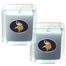 Our candle set features 2 lightly vanilla scented candles with fully cast metal Minnesota Vikings emblems that have an enameled team color finish. Officially licensed NFL product Licensee: Siskiyou Buckle. 2 glass candles. 2 x 2 inch candles. Lightly vanilla scented. Minnesota Vikings metal emblems