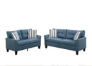 A perfect 2 piece sofa set to place in any living space will leads to a perfect furniture setting. Its construction involves the use of durable wood material comprising plywood base panel with solid pine frame draped in glossy polyfiber fabric in blue. This set comprises one loveseat and one sofa with contrasting accent pillows.