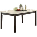 Turn your dining area into the most eye catching spot of your house by adding this elegant Dining Table. Lifted upon thick tapered legs finished in salvage dark oak brown color, this dining table features a white marble top that adds a lovely contrast to the wood work while also adding a classy touch to the design. Whether you are looking to outfit your dining room, entertainment area, or eat-in kitchen, this rectangular Dining Table offers a casual, rustic design you will always enjoy. Note: Other featured items in image except this Dining Table are sold separately.