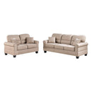 Make your living room look large and imperial with this sofa set consisting one 3-seat sofa and one loveseat. This sofa set features plush pillow double barrel styled back and seat rest trimmed in nickel finished buttons. Sand fabric material make it easily blend with any interior style. Accent pillows are included in this set for extra comfort.