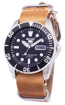 Made In Japan Stainless Steel Case Brown Leather Strap Automatic Movement Caliber: 7S26 23 Jewels Hardlex Crystal Black Dial Luminous Hands And Markers Day And Date Display Uni-Directional Rotating Bezel Screw Down Crown See Through Case Back Buckle Clasp 100M Water Resistance Approximate Case Diameter: 41mm Approximate Case Thickness: 13mm