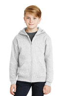 JERZEES¬ - Youth 8-Ounce Full Zip Hooded Sweatshirt. 993B 50/50 Cotton poly NuBlendFleece single ply hood with antique brass snap closure, coverseamed waistband, muff Pocket ribbed cuffs, set-in sleeves. Youth sizes: S(6-8), M(10-12), L (14-16)