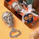 The skull is crafted from poly resin in a detailed design and has a pewter finish. Attached to the poly resin top is a sturdy silver metal bottle opener.