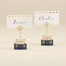 These Travel and Adventure Suitcase Place Card Holder presents guests with a themed guest gift as they walk into your venue and make their way to their seats! The place card holder features a double stack of suitcases in pink and blue, and comes with matching white place cards with gold foil details. For bridal showers, destination weddings, and travel themed engagement parties, the place card holder is a useful and memorable guest gift! Features and facts:Resin place card holder with a double stacked suitcase design and gold wire spiral place card holder. Comes in a set of 6 with 6 matching place cards.Place card holder measures 1.18" w x 0.94" d x 2.48" h, Place card measures 2.55" w x 0.003" d x 1.53" hSold in set of 6Place cards included