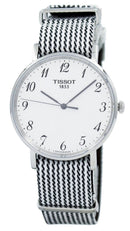 Stainless Steel Case Black And White Synthetic Strap Swiss Quartz Movement Caliber: ETA 902.101 Scratch Resistant Sapphire Crystal Silver/White Dial Arabic Numeral Pull/Push Crown Solid Case Back Buckle Clasp 30M Water Resistance Approximate Case Diameter: 38mm Approximate Case Thickness: 6.45mm