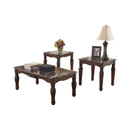 Spruce your living room with this traditional set of three tables in brown finish. It includes one coffee table and two end tables with a faux marble top, featuring polyurethane finish. Made from sturdy engineered wood and veneer, each table offers great space for decorative display of vases, frames and other items. Supported on turned legs, these table have curvy apron with carving accent.