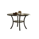 Make a casual country style dining setting in your dining space with the inclusion of this round dining table which features fixed top with metal ring and nail head trim. This dining table is made up of wood and veneer that features a classy walnut brown finish and has Curved Legs. You can complement this table with the matching set of chairs or chairs of some different style, this will blend with any interior setting. Other featured items in image except table are sold separately.