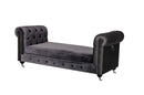 Make an elegant and glamorous statement in your home with this stylish Bench. With wooden frame construction, this bench is upholstered in dark gray velvet fabric and is accented by both button tufting and nail head trim. The bench features two silver ring handles on each side that adds flair to it and steel casters on the feet that makes shifting and re-arranging easy. Use this bench as a perch at the foot of your bed in the master suite or as a portable seat in your living room, entertainment room