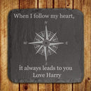 Romantic adventure's keepsake. Made from rustic slate Square shaped Personalise with a name The words 'When I follow my heart it always leads to you' and 'love' come as standard
