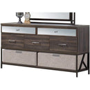 Add modern style and functional storage to your bedroom with this Dresser. The dresser rests on a metal base with two lower shelves to display decors or store baskets of out-the-door essentials. The upper portion of this dresser is constructed of wood and features three lower drawers with metal bar pulls and two top drawers with mirrored fronts to store your apparels. Complete with a rich walnut brown finish and geometric metal sides, this dresser will bring modern elegance to your bedroom. Note: Other featured items in image except this Dresser are sold separately.